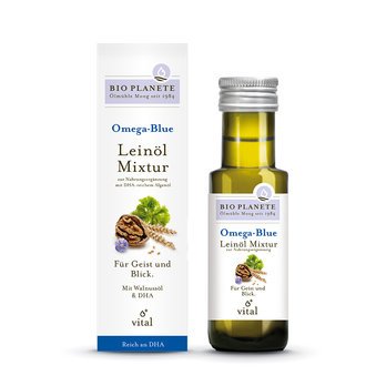 Unsere Leinöl-Mixtur Omega Blue enthält einen wertvollen Inhaltsstoff aus dem Meer: DHA (Docosahexaensäure), gewonnen aus Mikroalgen, ist eine mehrfach ungesättigte Fettsäure. Diese trägt bei einer täglichen Aufnahme von 250 mg (= 25 ml/2,5 EL Omega Blue) zur Erhaltung der normalen Gehirnfunktion und Sehkraft bei. Damit ist die regelmäßige Einnahme von DHA-haltigen Produkten besonders für Kinder, Schwangere und ältere Personen empfehlenswert. Basis von Omega Blue ist unser besonders mildes, 3-D-filtriertes Leinöl. Gemeinsam mit feinem Walnussöl ist die Mixtur geschmacklich und aufgrund ihres hohen Gehaltes an mehrfach ungesättigten Fettsäuren, insbesondere Alpha-Linolensäure (Omega 3), eine wertvolle Bereicherung für Ihren Speiseplan. Diese essentielle Fettsäure trägt bei einer täglichen Aufnahme von 2 g (6,3 ml/1 reichlicher TL Omega Blue) zur Aufrechterhaltung eines normalen Cholesterinspiegels im Blut bei. Das nussig-herbe Omega Blue passt hervorragend zu Blattsalaten, warmem Gemüse