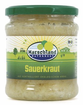 In annähernd gleichmäßige Streifen geschnittener biologischer Weißkohl, aus dem Sauerkraut durch natürliche Milchsäuregärung nach Zusatz von Meersalz entstanden ist, welches durch Pasteurisation im luftdicht verschlossenen Behältnis dauerhaft haltbar gemacht worden ist.