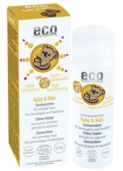 Hoher Lichtschutz für zarte Baby- und Kinderhaut. Die Baby & Kids Sonnencreme LSF 45 von eco cosmetics bietet einen Breitbandschutz vor UVA - B -C . Die sanfte Creme zieht rasch ein, weißelt nicht und wirkt direkt nach dem Auftragen. Auch kleine Wasserratten sind durch die wasserfeste Formel bestens geschützt. Granatapfel*,Oliven*- und Macadamiaöl* sorgen für Feuchtigkeit und Pflege. Sanddornextrakt* und Nachtkerzenöl* schützen besonders sensible Haut. Eine natürliche Duftkomposition verleiht einen angenehmen, milden Duft.