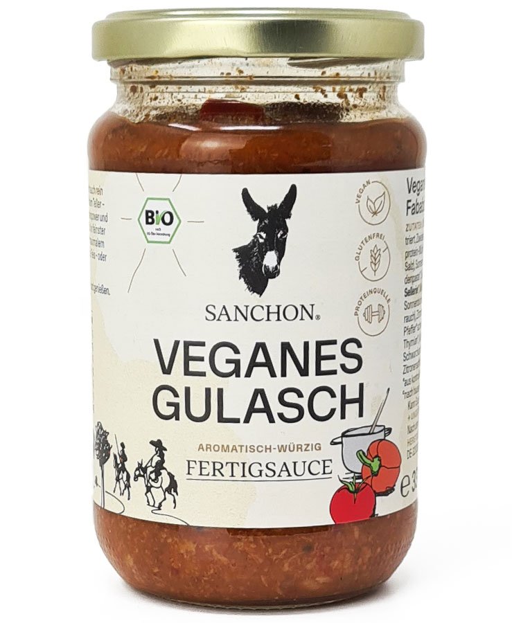 Sanchon veganes und glutenfreies Gulasch ist genau das Richtige, wenn es mal schnell gehen muss. Dieser neuinterpretierte Klassiker besticht durch seine fein abgeschmeckten und aromatischen Gewürze und passt perfekt zu Kartoffeln, Spätzle, Reis oder Gemüse.